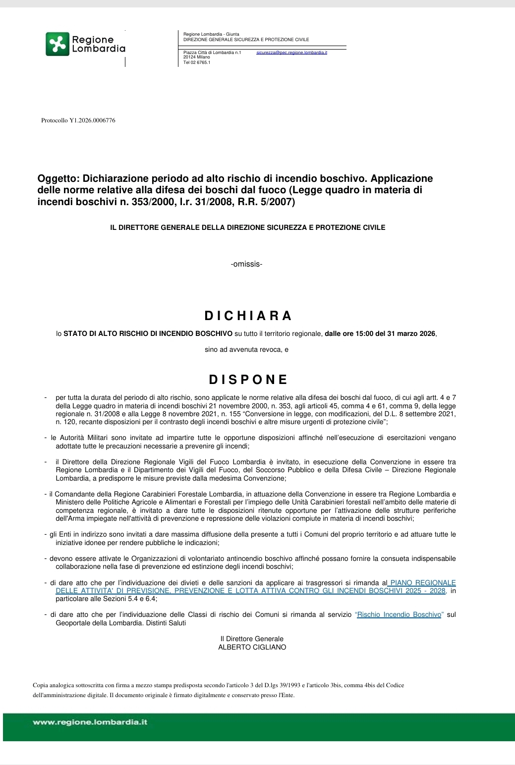 Regione Lombardia: Dichiarazione di periodo di alto rischio di incendio boschivo su tutto il territorio regionale, dalle ore 15:00 del 31 marzo 2026 sino ad avvenuta revoca.